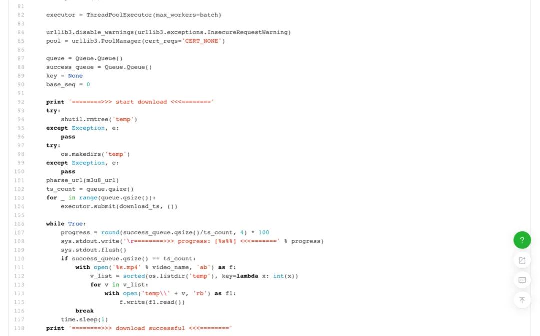 合并资源文件:这部分代码前半段是设置全局的队列和线程数。初始化临时目录,并触发线程启动。后半段是提供下载进度显示,使用已下载数量除以总数得到的百分比代表视频下载进度。最后,当全部下载完成后,将视频文件按照序号顺序合并成一个文件。