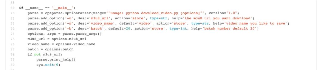 工具交互设计:前面讲了很多,还剩一个问题,我该如何告诉程序要下载哪个视频呢?这里就是工具的交互设计。我们把它设计成命令行工具,通过传参数的方式告诉工具这些信息。'-u':m3u8的网址、'-n':保存的视频文件名(默认是video)、'-b':并发下载数量,默认是20个并发。