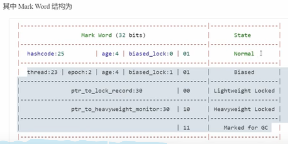 Mark word的结构:前25位表示hashcode,再后面4位表示分代年龄,再下面一位biased_lock表示是否为偏向锁,再后面两位表示加锁状态;