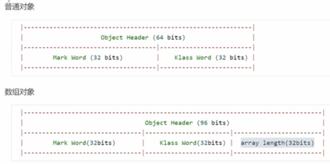 对象头包含Mark word(32位) 和 Klass word(32位)两部分,Klass word是一个指针,指向对象从属的Class对象;数组对象的话,还有一个用于表示数组长度的部分,占用32位也就是4个byte。