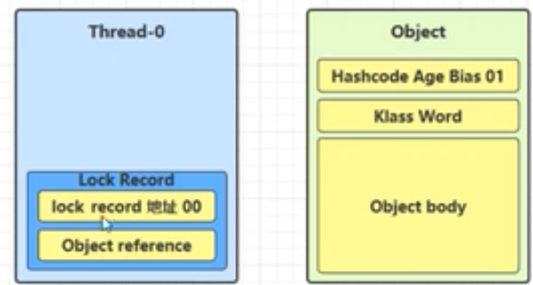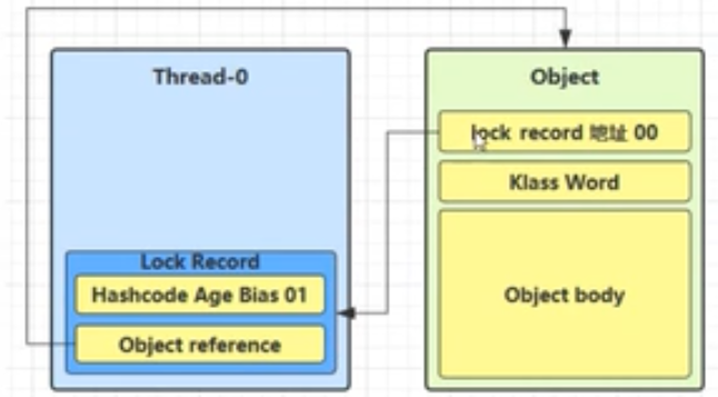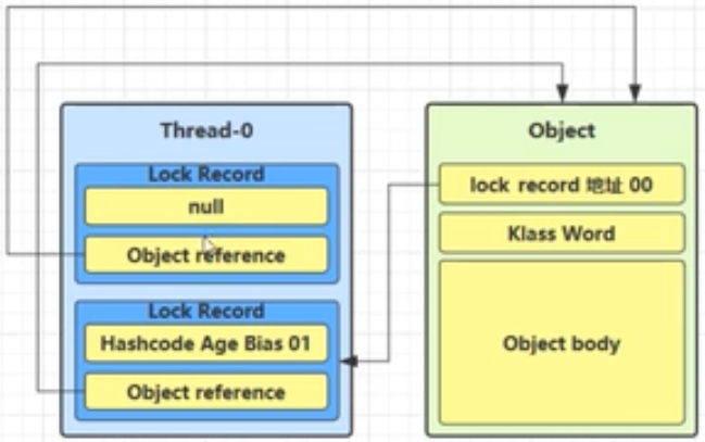 锁重入:同一个线程对同一个Object再次加锁,线程对象内将会再创建一个锁记录,并且尝试cas操作,cas失败,所以锁记录为null,这时如图:
