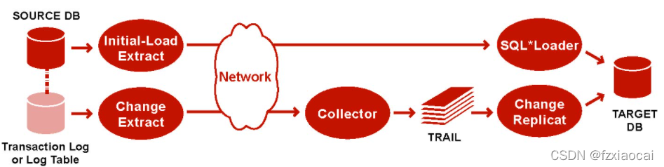 - Pump:把Trail文件以数据块的形式通过 TCP/IP协议发送到目标端