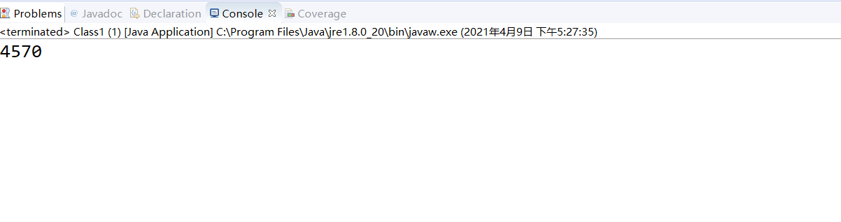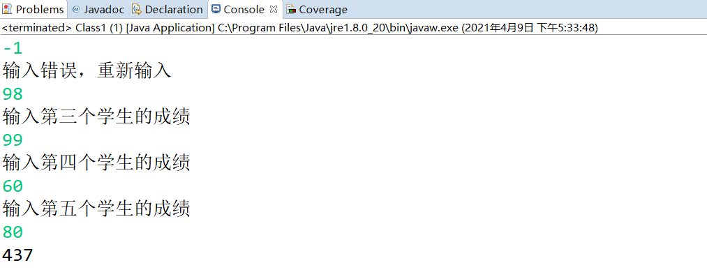 package Class; import java.util.Scanner; public class Class1 { /** * @param args */ public static void main(String[] args) { // TODO Auto-generated method stub Scanner input = new Scanner(System.in); System.out.println("输入第一个学生的成绩"); int a = input.nextInt(); if (a>100||a<0) { System.out.println("输入错误,重新输入"); a = input.nextInt(); } System.out.println("输入第二个学生的成绩"); int b = input.nextInt(); if (b>100||b<0) { System.out.println("输入错误,重新输入"); b = input.nextInt(); } System.out.println("输入第三个学生的成绩"); int c = input.nextInt(); if (c>100||c<0) { System.out.println("输入错误,重新输入"); c = input.nextInt(); } System.out.println("输入第四个学生的成绩"); int d = input.nextInt(); if (d>100||d<0) { System.out.println("输入错误,重新输入"); d = input.nextInt(); } System.out.println("输入第五个学生的成绩"); int e = input.nextInt(); if (e>100||e<0) { System.out.println("输入错误,重新输入"); e = input.nextInt(); } int sum = 0; sum = a+b+c+d+e; System.out.println(sum); } }