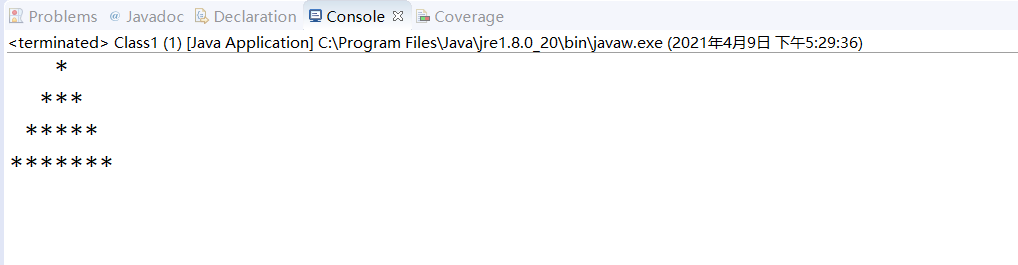 package Class; public class Class1 { /** * @param args */ public static void main(String[] args) { // TODO Auto-generated method stub for (int i = 1; i < 5; i++) { for (int j = 4-i; j >0; j--) { System.out.print(" "); } for (int j = 1; j <= i*2-1; j++) { System.out.print("*"); } System.out.println(); } } }
