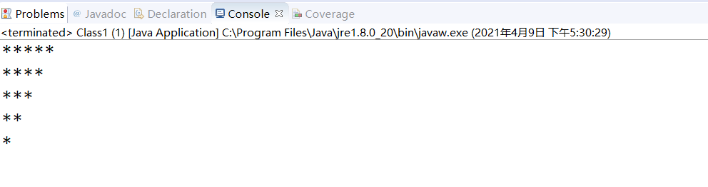 package Class; public class Class1 { /** * @param args */ public static void main(String[] args) { // TODO Auto-generated method stub for (int i = 1; i < 6; i++) { for (int j = 5-i; j >= 0; j--) { System.out.print("*"); } System.out.println(); } } }