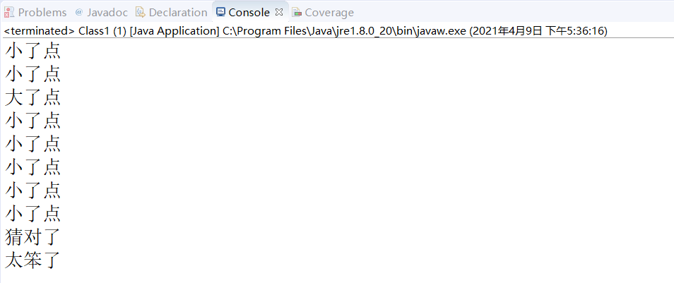 package Class; import java.util.Random; import java.util.Scanner; public class Class1 { /** * @param args */ public static void main(String[] args) { // TODO Auto-generated method stub Random i = new Random(); int a = i.nextInt(99)+1; int b = 0; while(true){ if(a>88){ System.out.println("大了点"); a = i.nextInt(99)+1; b++; } if(a<88){ System.out.println("小了点"); a = i.nextInt(99)+1; b++; } if(a==88){ System.out.println("猜对了"); break; } } if(b<3){ System.out.println("太棒了"); } if(b>5&&b<=8){ System.out.println("一般般"); } if(b>8){ System.out.println("太笨了"); } } }