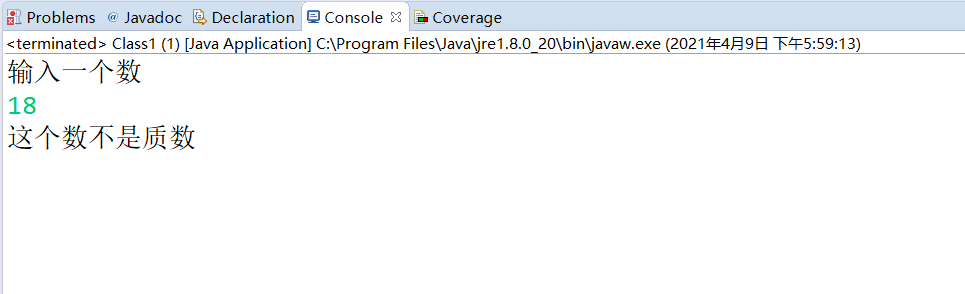 package Class; import java.util.Random; import java.util.Scanner; public class Class1 { public static void main(String[] args) { // TODO Auto-generated method stub //2.输入一个数,判断是不是质数(只能被1和自身整除的数是质数) Scanner input = new Scanner(System.in); System.out.println("输入一个数"); int n = input.nextInt(); int j = (int) Math.sqrt(n); for (int i = 2; i < j; i++) { if(n%i == 0) { System.out.println("这个数不是质数");break; } else { System.out.println("这个数是质数");break; } } } }