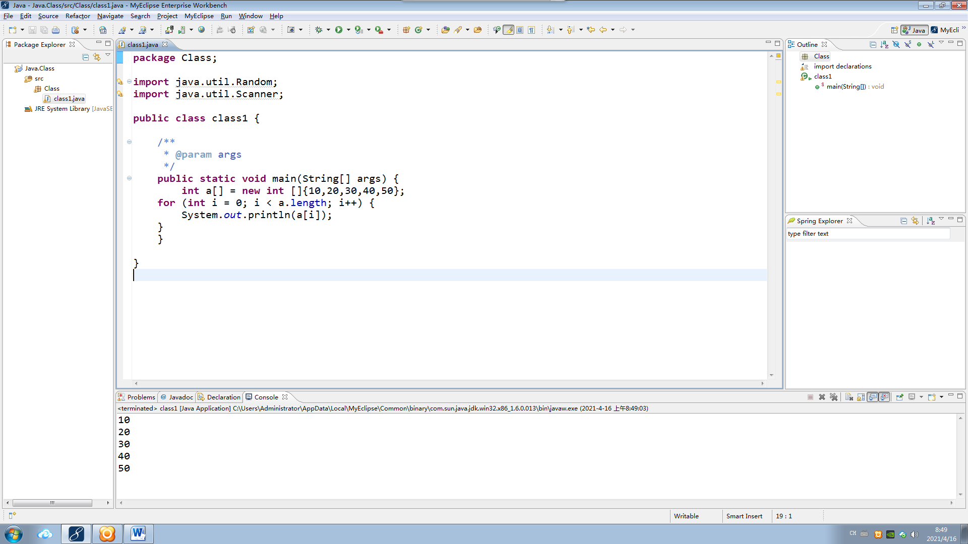 package Class; import java.util.Random; import java.util.Scanner; public class class1 { /** * @param args */ public static void main(String[] args) { int a[] = new int []{10,20,30,40,50}; for (int i = 0; i < a.length; i++) { System.out.println(a[i]); } } }