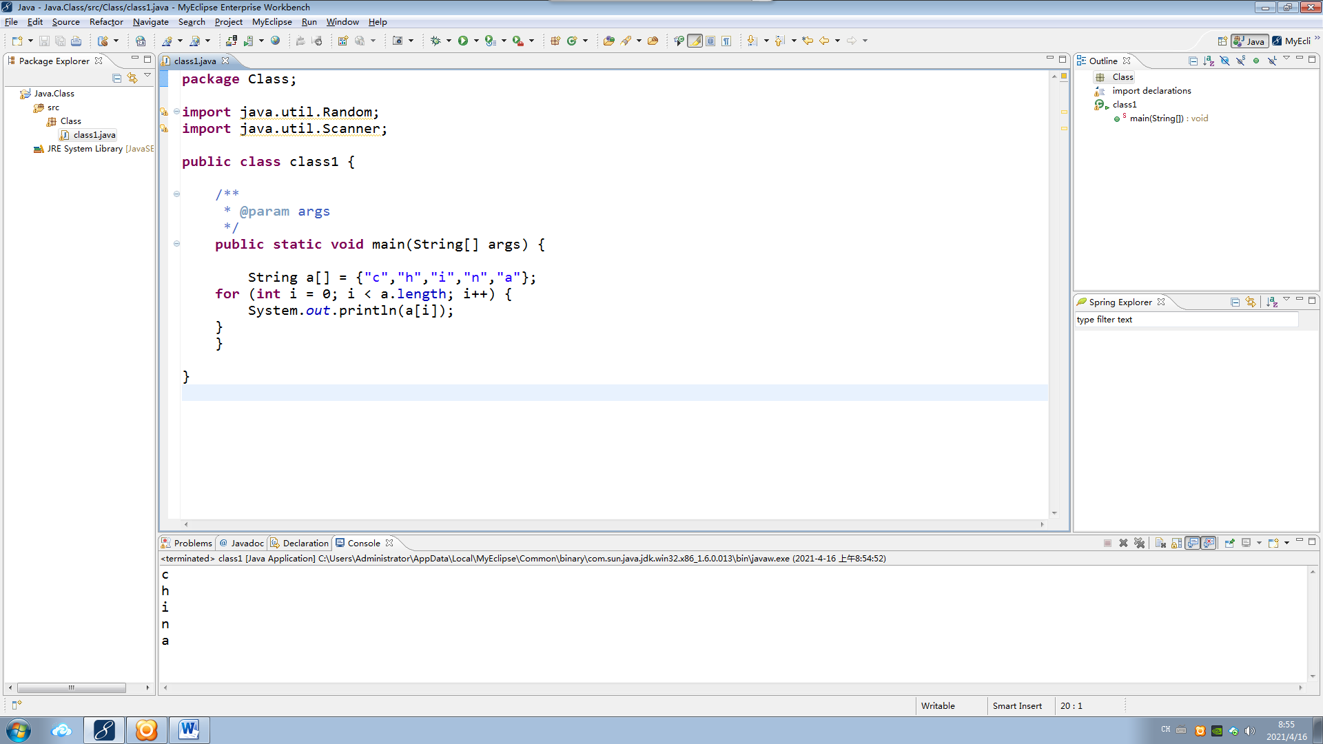 package Class; import java.util.Random; import java.util.Scanner; public class class1 { /** * @param args */ public static void main(String[] args) { String a[] = {"c","h","i","n","a"}; for (int i = 0; i < a.length; i++) { System.out.println(a[i]); } } }