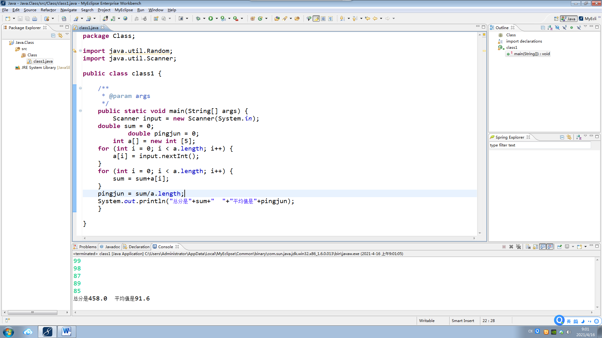 package Class; import java.util.Random; import java.util.Scanner; public class class1 { /** * @param args */ public static void main(String[] args) { Scanner input = new Scanner(System.in); double sum = 0; double pingjun = 0; int a[] = new int [5]; for (int i = 0; i < a.length; i++) { a[i] = input.nextInt(); } for (int i = 0; i < a.length; i++) { sum = sum+a[i]; } pingjun = sum/a.length; System.out.println("总分是"+sum+" "+"平均值是"+pingjun); } }