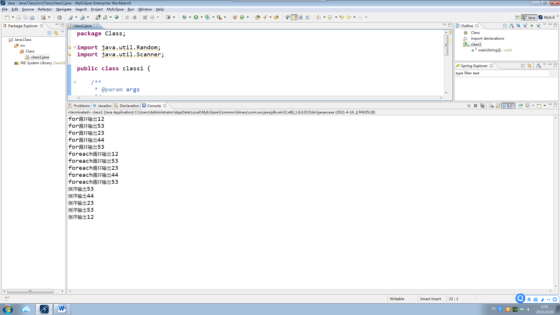 package Class; import java.util.Random; import java.util.Scanner; public class class1 { /** * @param args */ public static void main(String[] args) { int a[] = new int []{12,53,23,44,53}; for (int i = 0; i < a.length; i++) { System.out.println("for循环输出"+a[i]); } for (int i : a) { System.out.println("foreach循环输出"+i); } for (int i = 4; i >= 0; i--) { System.out.println("倒序输出"+a[i]); } } }
