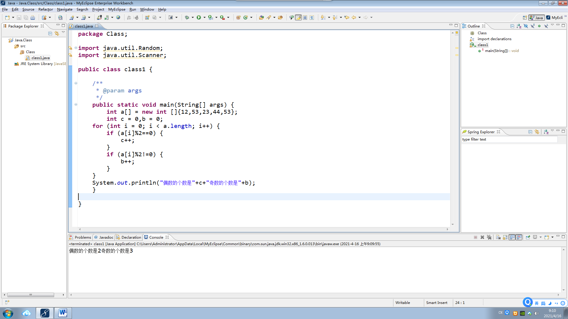 package Class; import java.util.Random; import java.util.Scanner; public class class1 { /** * @param args */ public static void main(String[] args) { int a[] = new int []{12,53,23,44,53}; int c = 0,b = 0; for (int i = 0; i < a.length; i++) { if (a[i]%2==0) { c++; } if (a[i]%2!=0) { b++; } } System.out.println("偶数的个数是"+c+"奇数的个数是"+b); } }
