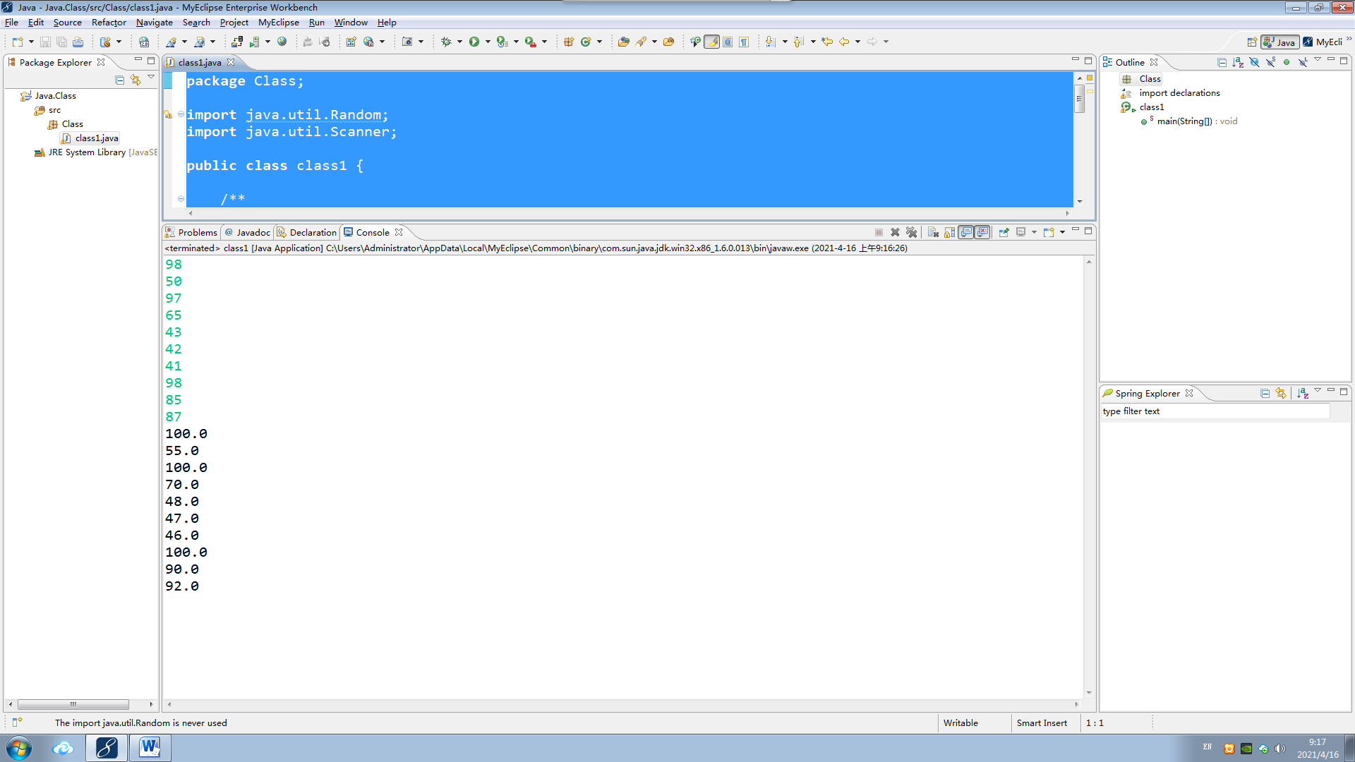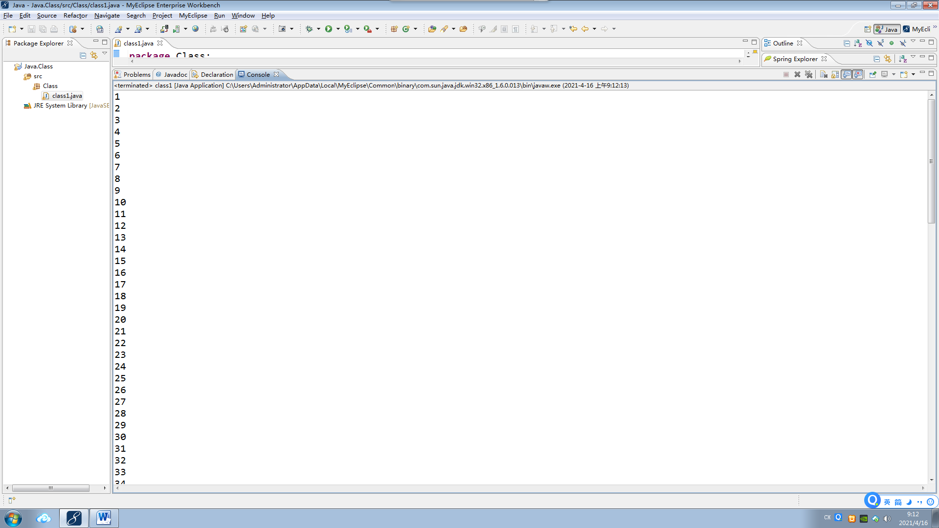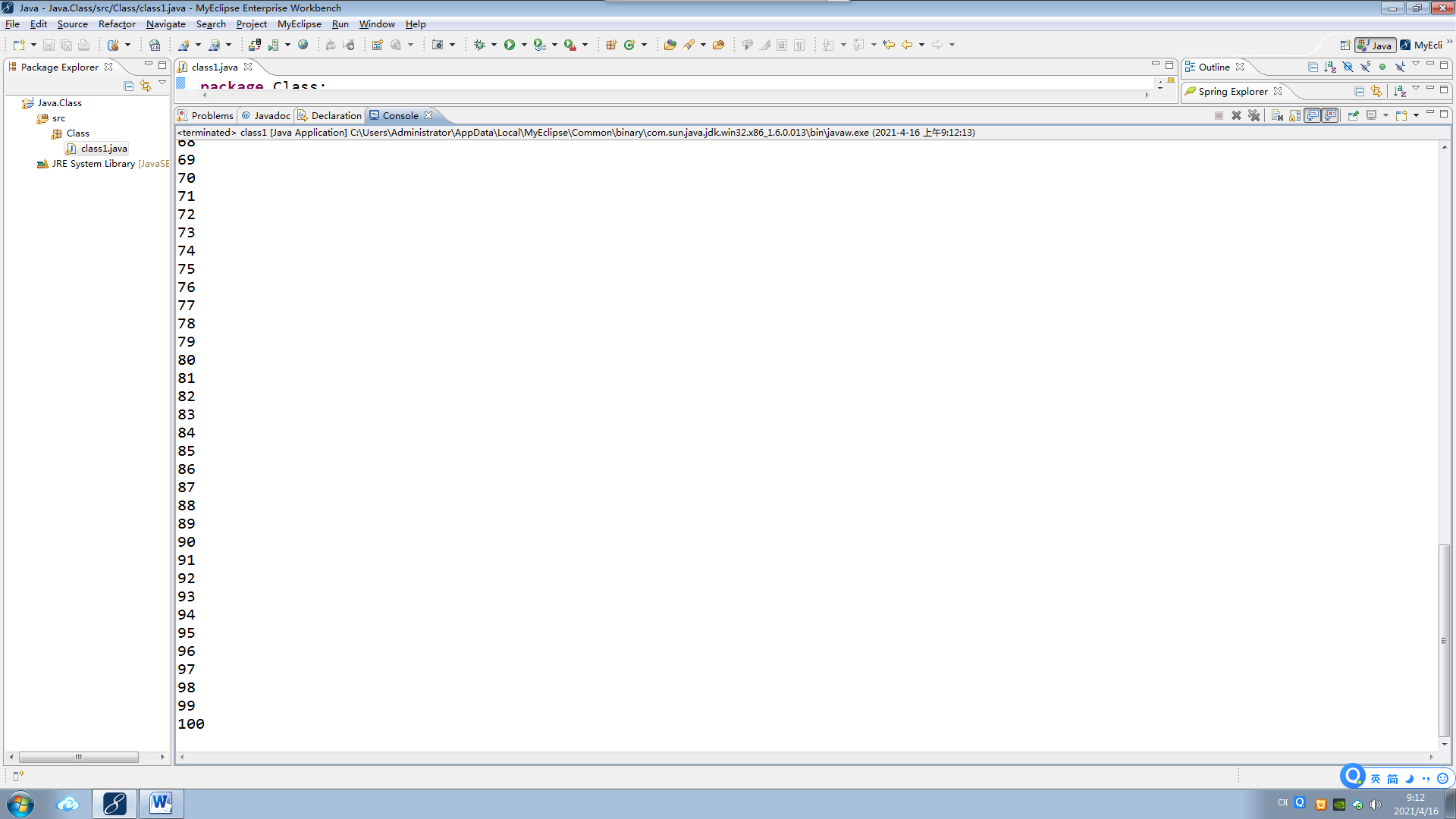 package Class; import java.util.Random; import java.util.Scanner; public class class1 { /** * @param args */ public static void main(String[] args) { int a[] = new int [100]; for (int i = 0; i < a.length; i++) { a[i]=i+1; } for (int i = 0; i < a.length; i++) { System.out.println(a[i]); } } }