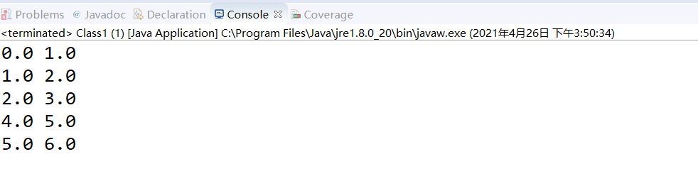 package Class; public class Class1 { /** * @param args */ public static void main(String[] args) { // TODO Auto-generated method stub double a[][] = new double [][]{{0,1},{1,2},{2,3},{4,5},{5,6}}; for (int i = 0; i < a.length; i++) { for (int j = 0; j < a[i].length; j++) { System.out.print(a[i][j]+" "); } System.out.println(); } } }