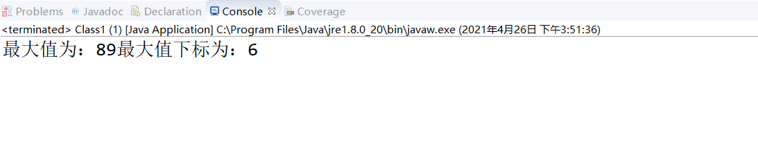package Class; public class Class1 { /** * @param args */ public static void main(String[] args) { // TODO Auto-generated method stub int a[] = new int[]{18,25,7,36,13,2,89,63}; int max = a[0]; int maxindex = 0; for (int i = 1; i < a.length; i++) { if (max<a[i]) { int c = 0; c = a[i]; a[i] = max; max = c; maxindex = i; } } System.out.println("最大值为:"+max+"最大值下标为:"+maxindex); } }