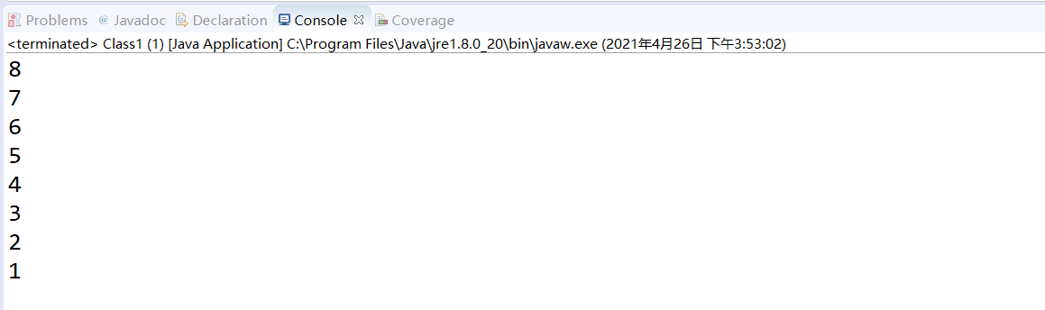 package Class; public class Class1 { /** * @param args */ public static void main(String[] args) { // TODO Auto-generated method stub int a[] = new int []{1,6,2,3,8,4,5,7}; for (int i = 0; i < a.length-1; i++) { for (int j = 0; j < a.length-1-i; j++) { if (a[j]<a[j+1]) { int c; c = a[j]; a[j] = a[j+1]; a[j+1] = c; } } } for (int i = 0; i < a.length; i++) { System.out.println(a[i]); } } }