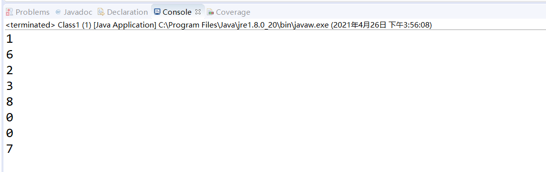 package Class; public class Class1 { /** * @param args */ public static void main(String[] args) { // TODO Auto-generated method stub int a[] = new int []{1,6,2,3,8,6,8,7}; for (int i = 0; i < a.length-1; i++) { for (int j = i+1; j < a.length; j++) { if(a[i]==a[j]&&i!=j) { a[j] = 0; } } } for (int i = 0; i < a.length; i++) { System.out.println(a[i]); } } }