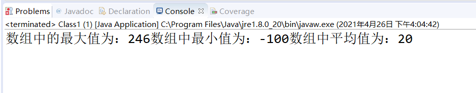 package Class; public class Class1 { /** * @param args */ public static void main(String[] args) { // TODO Auto-generated method stub int a[] = new int []{ -10,2,3,246,-100,0,5}; int sum = 0; int pingjun = 0; int max = a[0]; int min = a[0]; for (int i = 0; i < a.length-1; i++) { sum = sum+a[i]; } pingjun = sum/a.length; for (int i = 1; i < a.length; i++) { if (max<a[i]) { int c = 0; c = a[i]; a[i] = max; max = c; } } for (int i = 1; i < a.length; i++) { if (min>a[i]) { int c = 0; c = a[i]; a[i] = min; min = c; } } System.out.println("数组中的最大值为:"+max+"数组中最小值为:"+min+"数组中平均值为:"+pingjun); } }