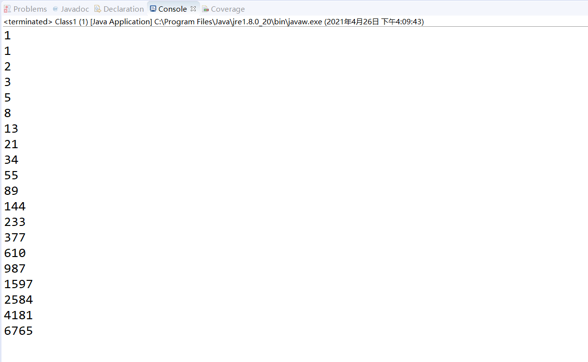 package Class; public class Class1 { /** * @param args */ public static void main(String[] args) { // TODO Auto-generated method stub int a[] = new int [20]; a[0] = 1; a[1] = 1; for (int i = 2; i < a.length; i++) { a[i] = a[i-1]+a[i-2]; } for (int i = 0; i < a.length; i++) { System.out.println(a[i]); } } }