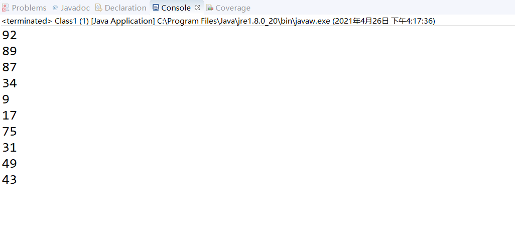 package Class; import java.util.Random; public class Class1 { /** * @param args */ public static void main(String[] args) { // TODO Auto-generated method stub Random b = new Random(); int a[] = new int [10]; for (int i = 0; i < a.length; i++) { int c = b.nextInt(101); a[i] = c; } for (int i = 0; i < a.length-1; i++) { for (int j = 0; j < a.length-1-i; j++) { if (a[i]>a[j]) { int d = 0; d = a[i]; a[i] = a[j]; a[j] = d; } } } for (int i = 0; i < a.length; i++) { System.out.println(a[i]); }