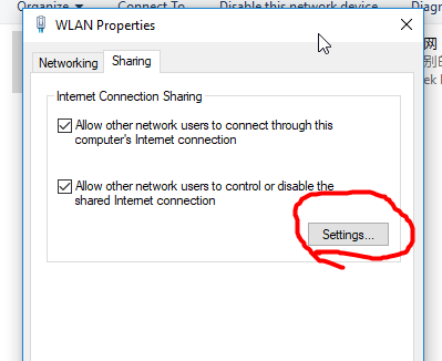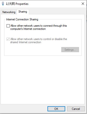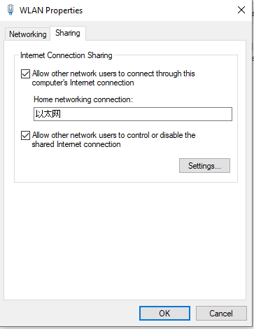 打到上图窗口,只有红色方框中的WLAN共享网络,别的都不要共享。(具体操作是:右键>属性>共享>"允许balabala"两个勾都勾上,然后选择共享的网络为以太网。如下图所示)