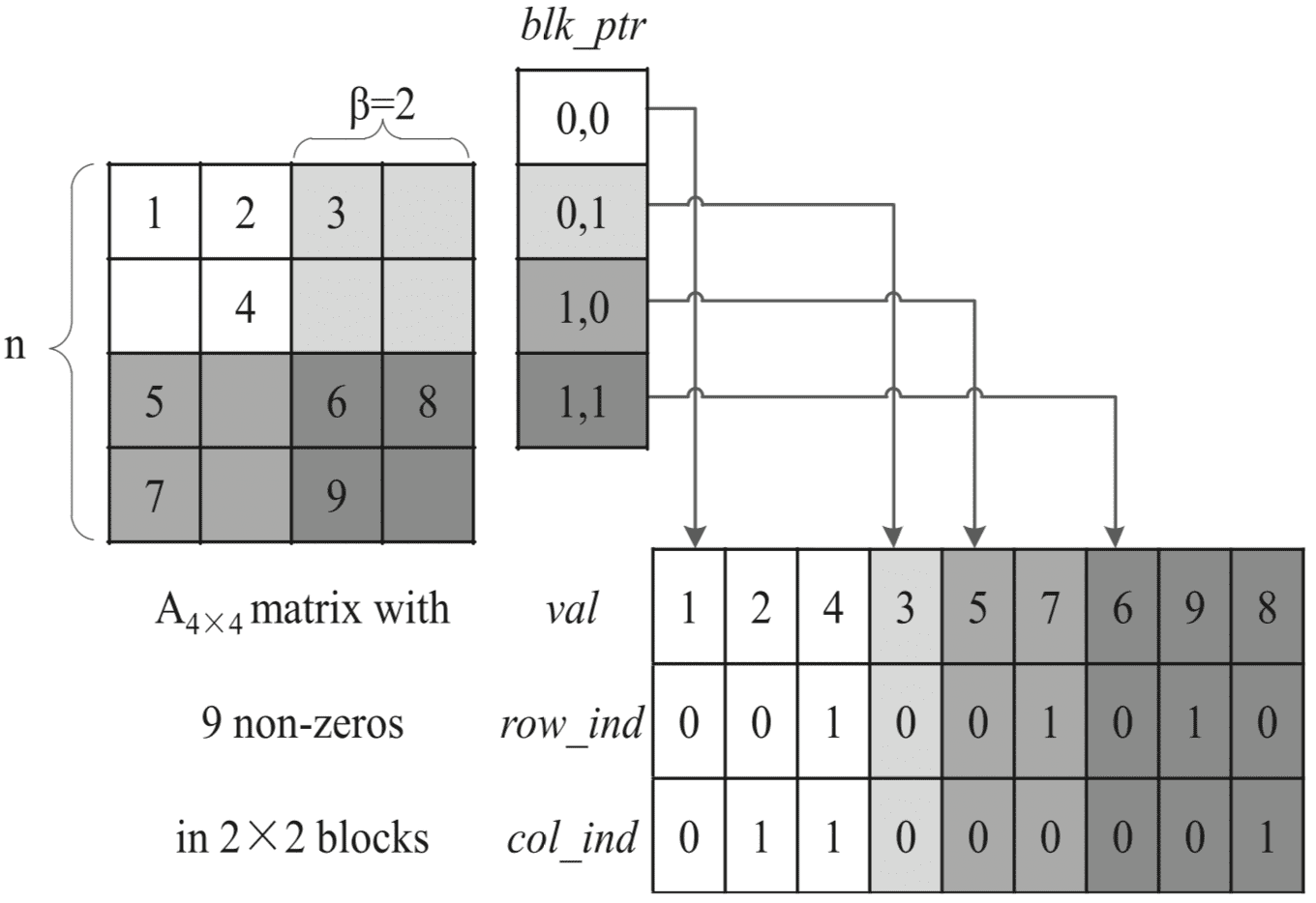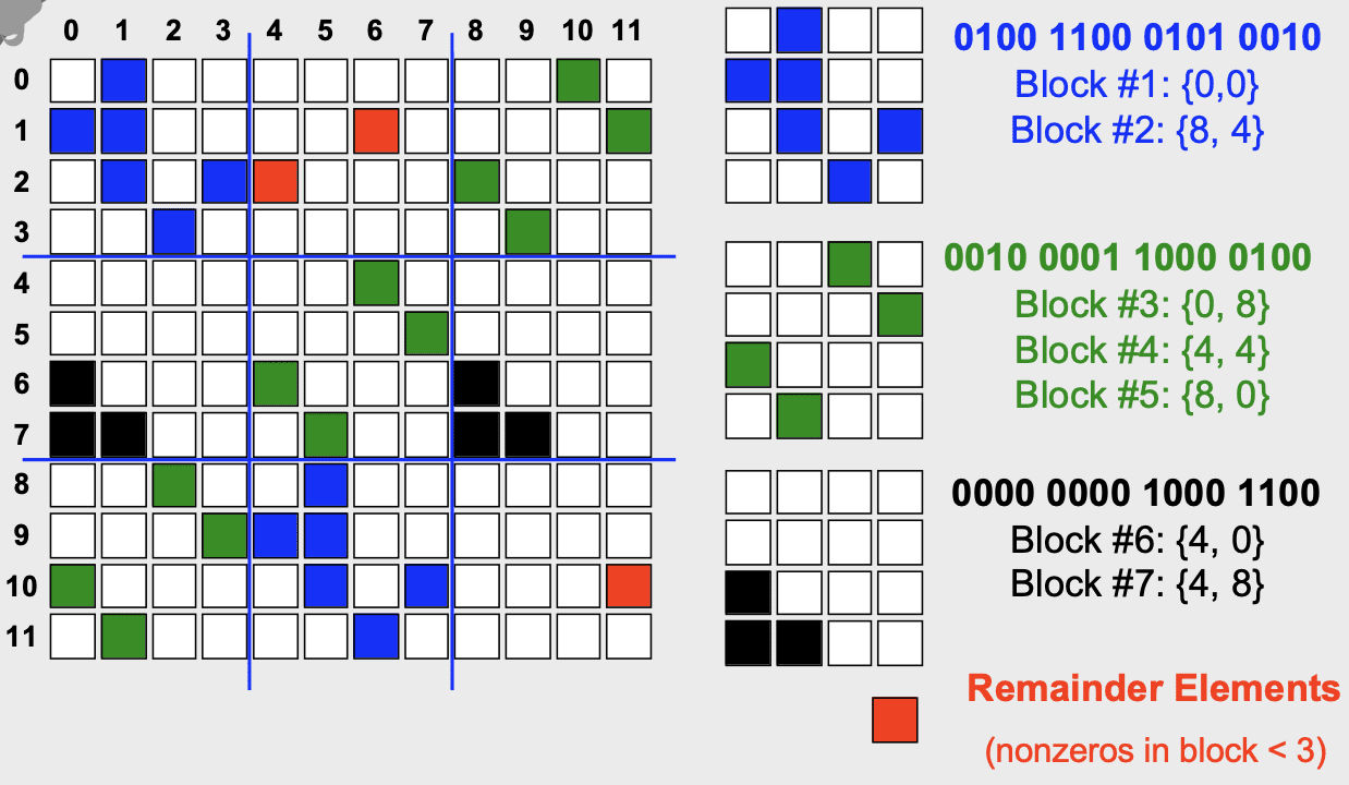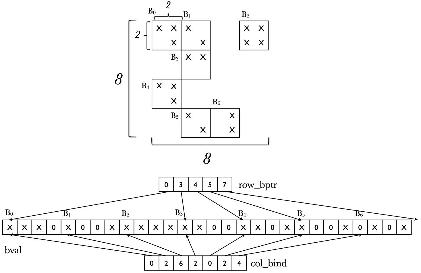 分块矩阵的存储,用COO存储矩阵块,然后从CSR、COO、Bitmap、Dense选一个类型来存储子矩阵块内部的元素: