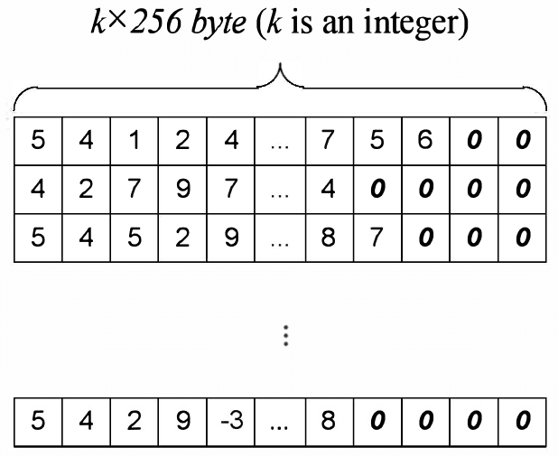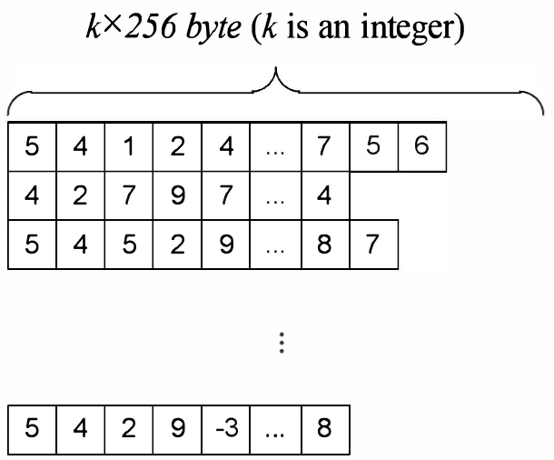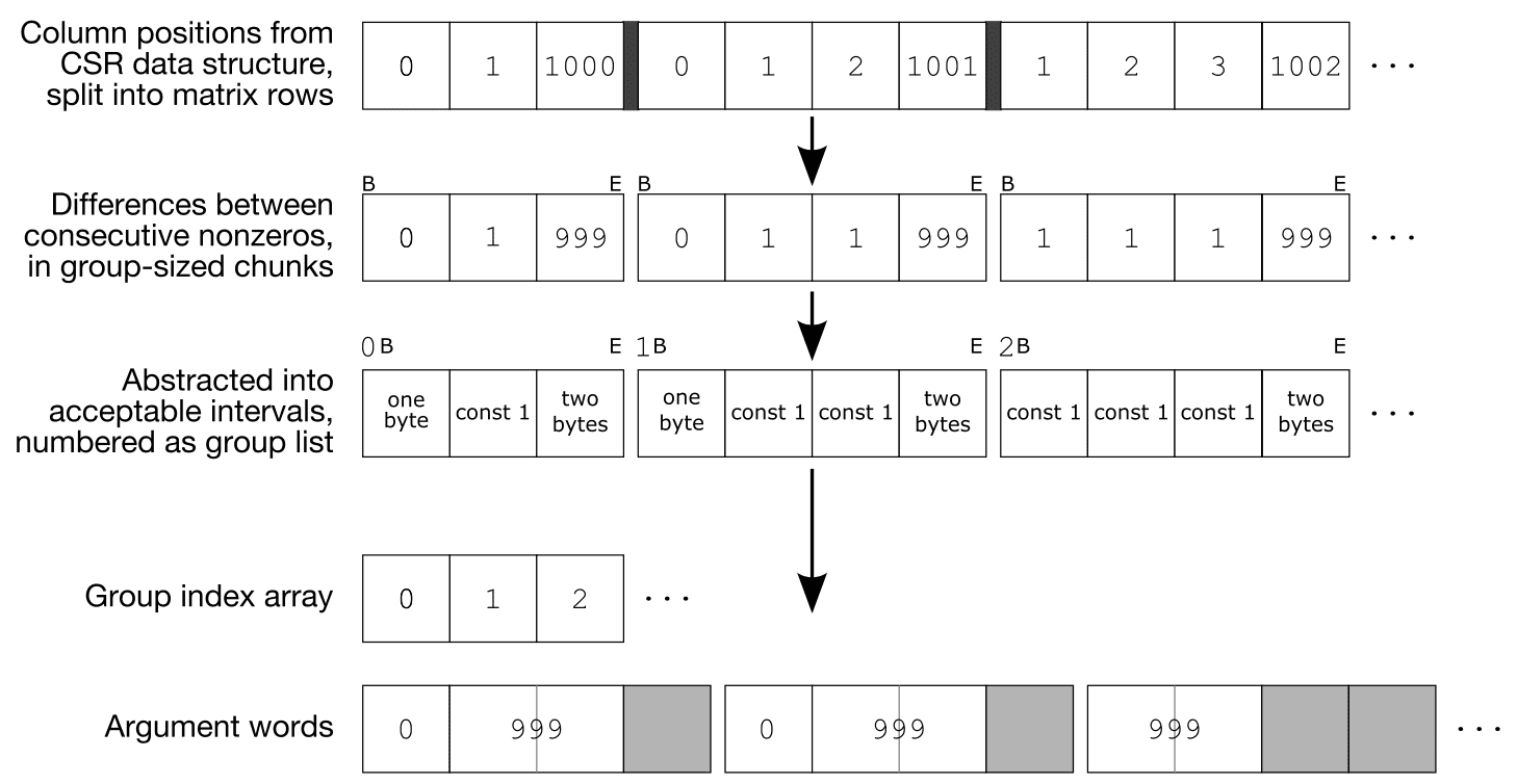 上图是一个压缩的过程,后面三行是压缩的结果。首先先将CSR数据的列索引进行分组,这里是一行一组(如第一行所示)。然后每一组分别计算相邻列索引之间的差值(如第二行所示)。然后根据差值的大小,选择合适的差值类型(第三行所示),比如999就是两个字节,0是一个字节,1是常量。对于不是常量的差值类型,需要一个额外的参数来记录相邻列索引大小差值的具体值(第五行)。当然,因为分组了,所以还需要一个组索引。虽然多引入了一些数组(后三个),但是这些数组要么更短、要么数组元素需要的空间更小,所以可以达到压缩效果。
