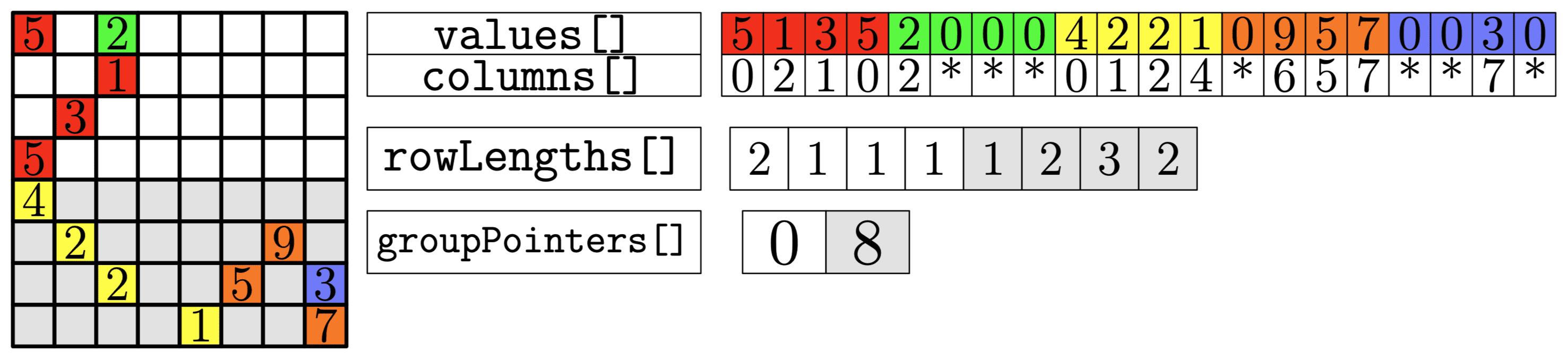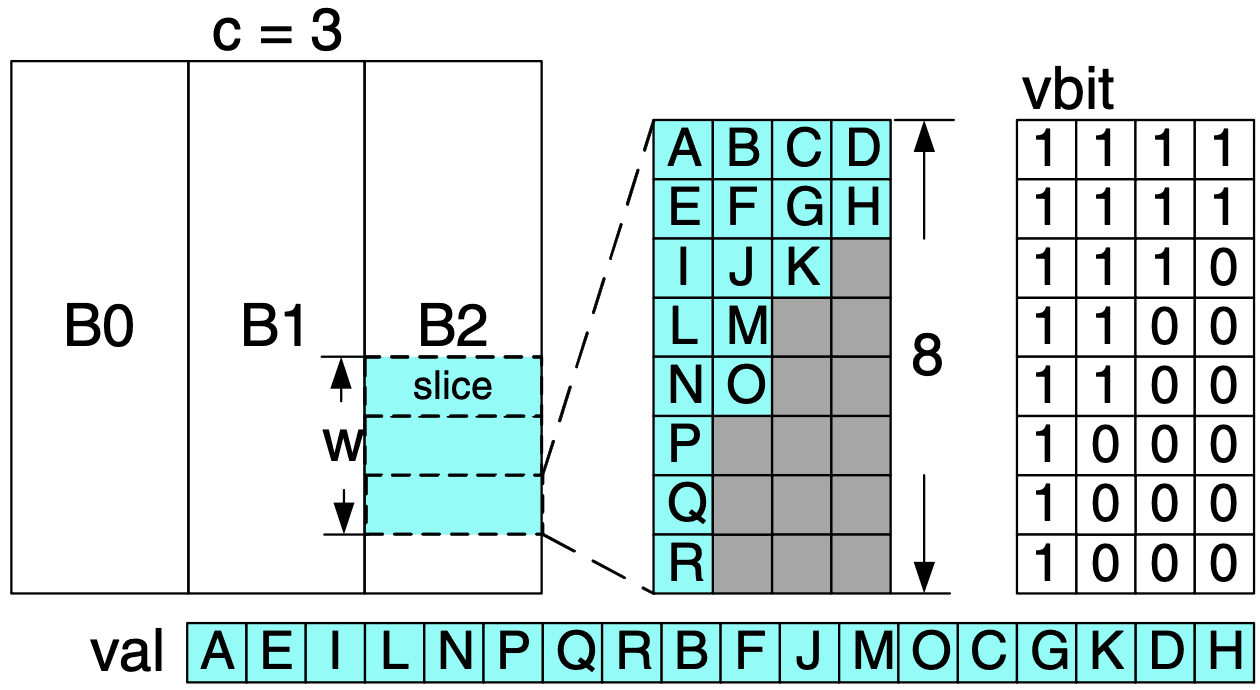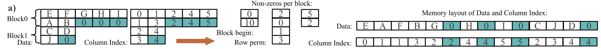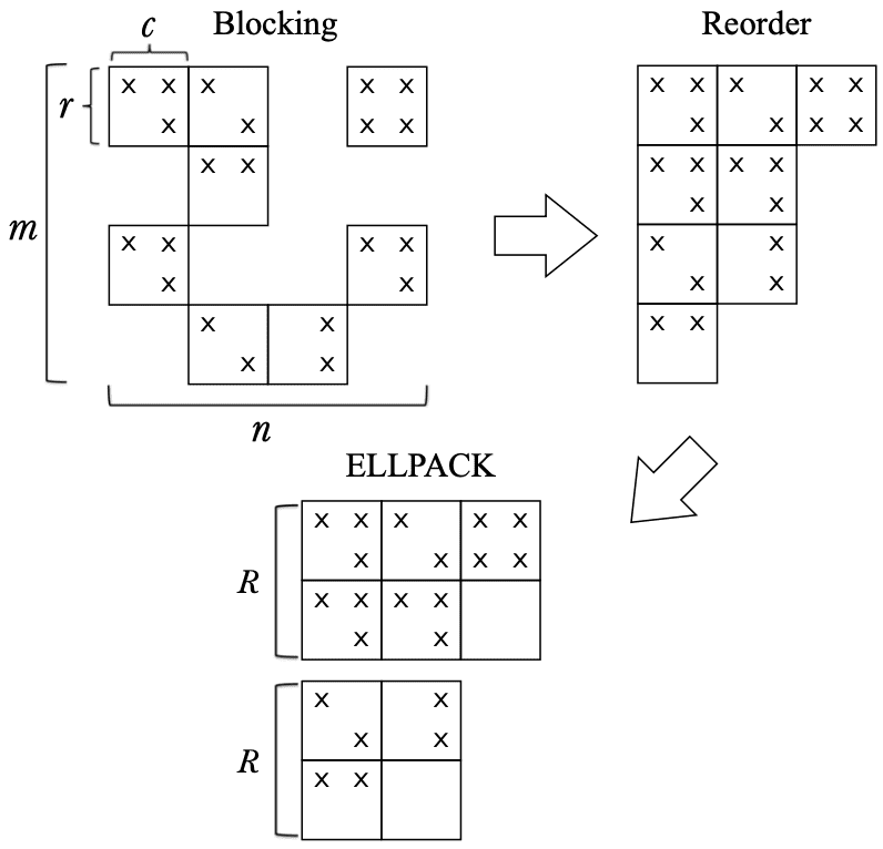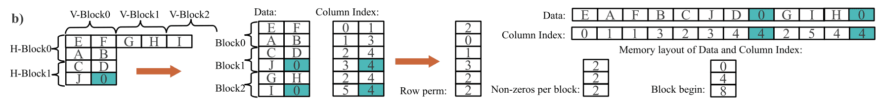 本质上还是SELL,但是有一些改进。首先是没有行排序,文章认为,按照行长度交换行的顺序,会带来很大的处理前和处理后开销。其次,除了在行方向上进行切分之外,还在列方向上进行切分。并且对于一个条带,要把每一行的非零元数量padding到一致,然后在进行列切分。从而产生一个大致像SELL的,但是每一行有多个线程的数据格式。如下图所示。