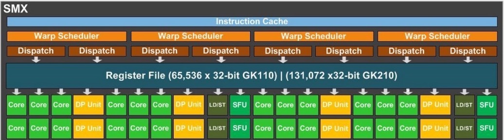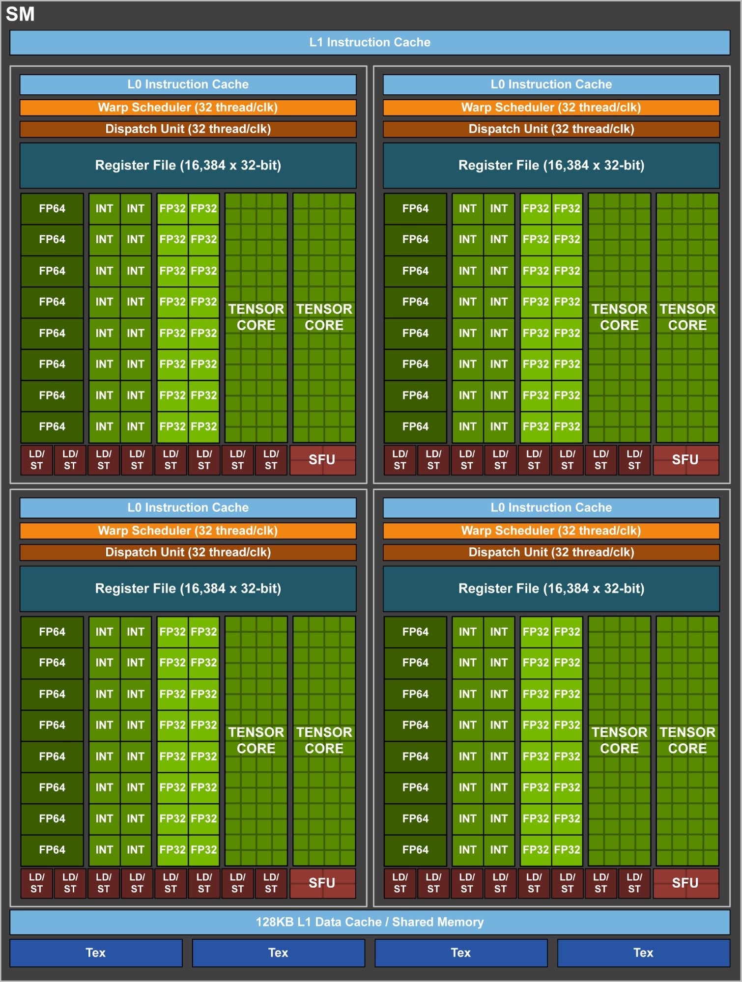 在科学计算的负载中,全局内存的数据可能出现在L2 cache,L1 cache和Texture cache中。下图是一个SM内部的结构:
