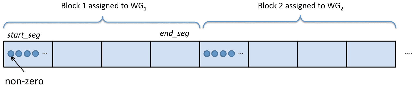 为了进一步提升wrap之间的负载均衡,我们要在之前的分组的基础上进一步分段(segment),因为之前已经进行了排序,所以每一段中的SIC行(CSR组)长度是类似的,所以通过每一段启动一个kernal,段中每组一个wrap,wrap之间的负载也是类似的。每一段包含的SIC行数是满足一定的范围的,这篇文章一共将SIC行分为5个段:长度>32,32>长度>16,16>长度>8,8>长度>4,长度<4。因为每一段一个kernal,为了能够吃满GPU,可以通过GPU的SM数量、active block数量等参数计算出需要吃满GPU需要的wrap数量,如果某一段SIC行数太小,吃不满GPU,那就将其和相邻的段合并执行。