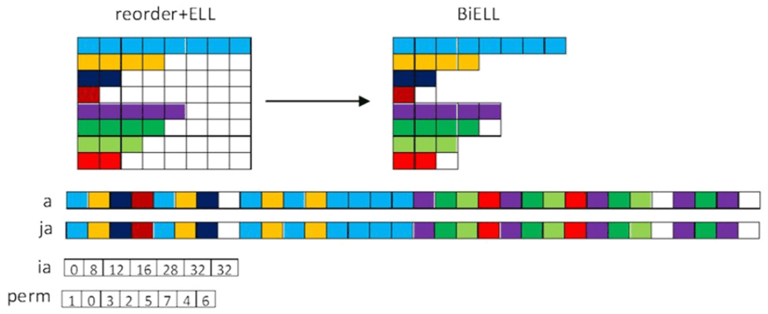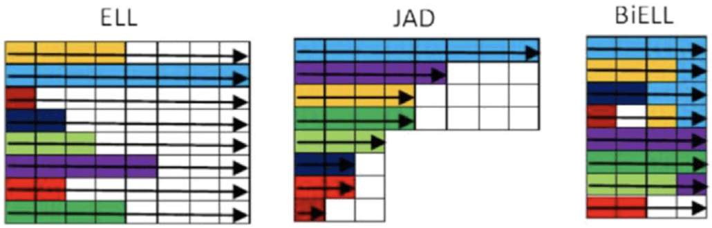 上面是ELL、JAD(行非零元排序版的ELL,然后按照wrapsize来分条带,列方向并行)和BiELL。