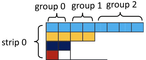 BiELL在JAD的基础上进一步改进,除了先分条带,然后按照行非零元数量降序排列,还在条带的基础上进一步再进行分组。因为不规则的分组、分块、分条带都会引入新的索引,增加存储负担,所以BiELL的组是规则分布、大小是规则变化的。如上图,假设wrapsize=4,组的分布是在一个条带(strip)严丝合缝、从左到右,组在列方向的长度从strip的最大行数开始一次次减半变化的,而行方向的长度是由当前组的下半部分的最多行非零元数量决定的。比如上图的group0,是第一个组,所以行数和条带的行数是一样的;而因为下一个组(group1)在列方向的长度会减半,所以为了防止有些非零元被遗漏,所以group的长度必须包含到自己完整的下半部分,也就是第3、4两行,所以这个group需要两列,在这一组内长度不够的行要补0。
