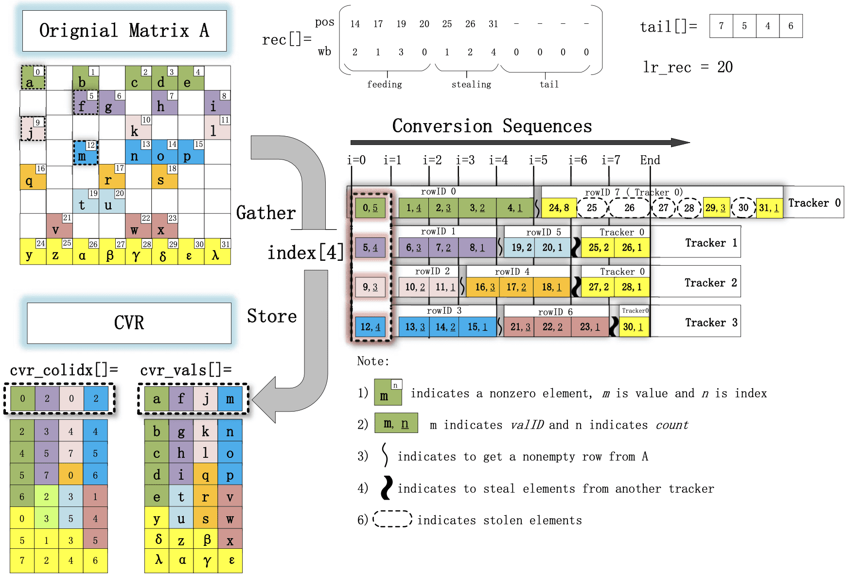 HCC整体的思路和CSR5差别不大,主要是列分块的引入,并且行和列横跨了两种不同的分块策略:列是按照固定宽度的分块,行分块是在列条带的基础上按照非零元数量的分块。这样子就同时保证了x和y的局部性。