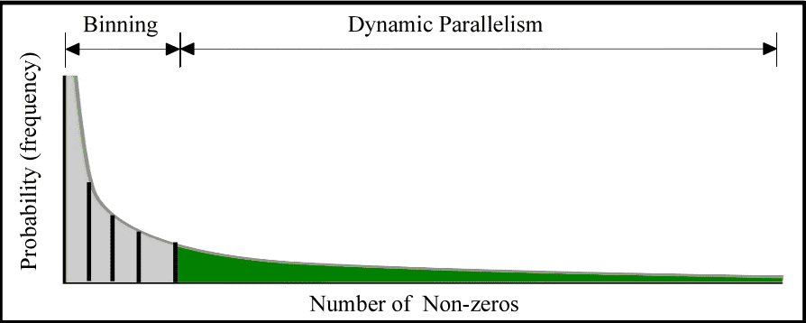 对非零元比较少的行以组(Bin)为单位来执行SpMV(如图中的上面两个SpMV)。这样子就保证了一些非零元特别少的组(Bin)中,可以合并到一个内核中进行处理,防止因为非零元实在是太小,甚至不到一个Thread wrap所导致的难以高效地并行。