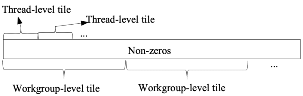 上图是一个极度不均匀的矩阵,每行至少一个线程。为了解决负载均衡问题,将每一行划分为一个个chunk,chunk size(= 2)是一个可配置项,平衡了负载。
