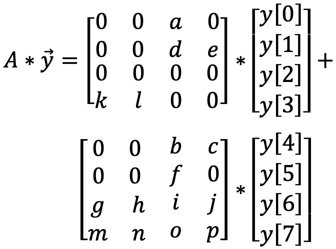 结果的规约。假设我们有一个矩阵,矩阵已经被分块,不考虑列方向的分条带,每个线程分四个块,分别和向量的不同部分做加权和。如下图所示。