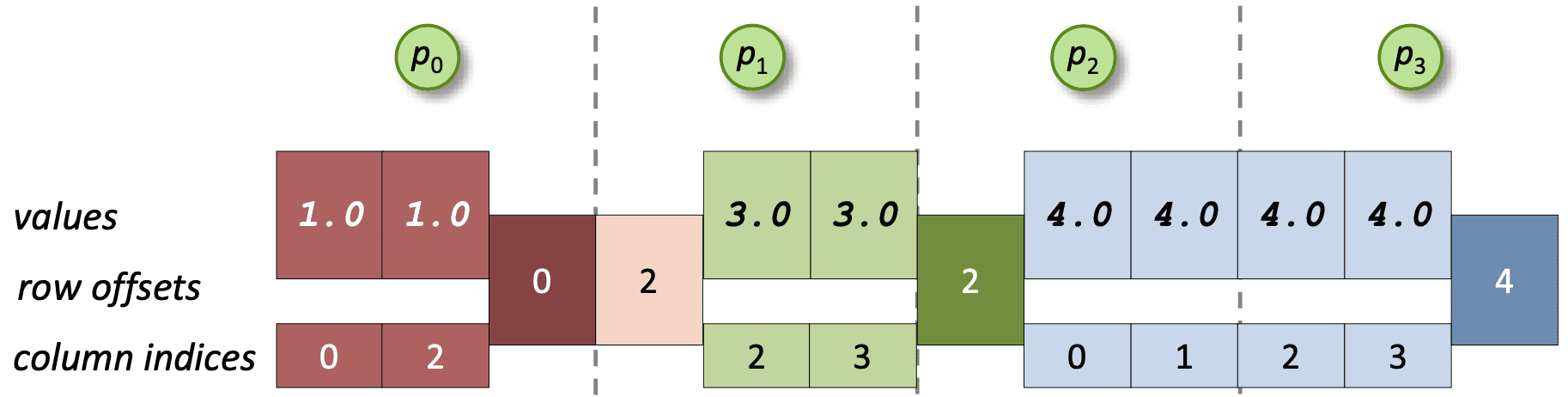 可以看到,行索引插到了值数组中行交界的位置,并且也占用被合并之后列表的一个位置,最终将合并之后的列表均分给不同的处理器。其中,因为第1行是一个空行,所以0、2两个行索引相邻放在一起。