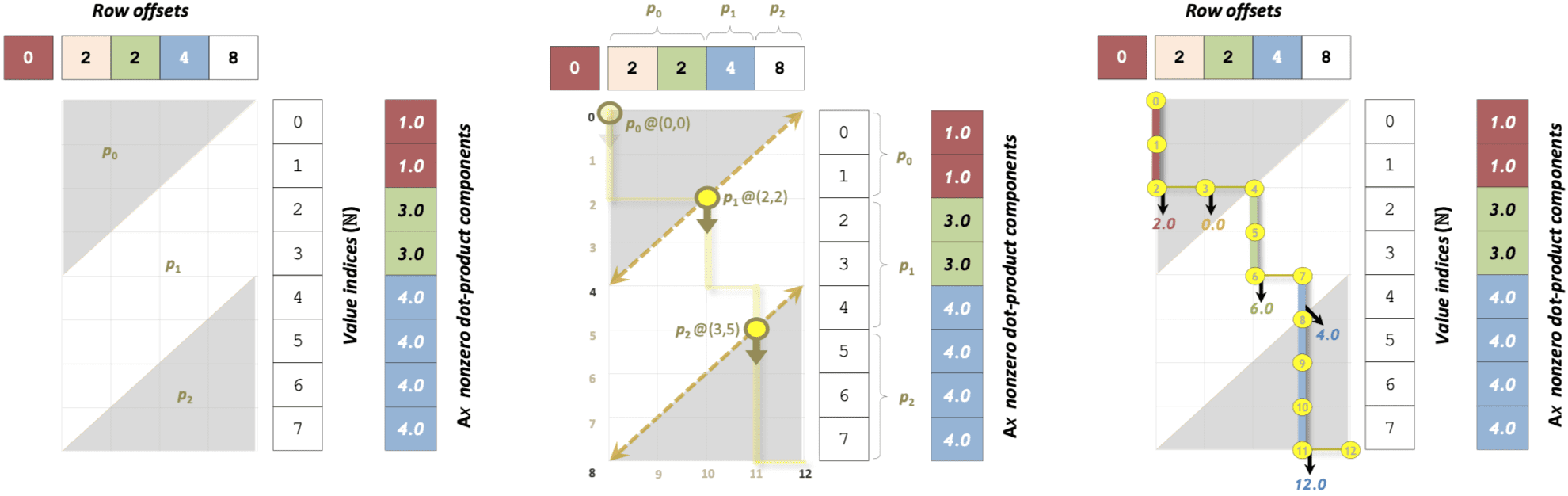 从左到右看这个图,首先行索引和值数组相互垂直放置,二者之间就构成一个长方形的“决策空间”,SpMV的过程是一个从决策空间左上角走到右下角的过程,往下走代表遍历值数组,计算加权和,往右走代表要算新的一行了,写输出(y),清空临时数据。当值数组的索引小于等于CSR中行索引数组对应的值时,就往下走,反之就代表到了遍历到新的行了,向右走。