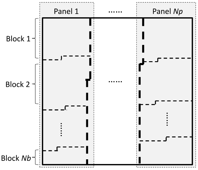 如上图所示,首先进行列分块,其中每个条带的宽度是固定的,然后在列分块(Panel)的基础上对每一个列条带进行单独的行分块,但是行分块是不padding、不对齐的,这里的行分块和CSR5以及yaSpMV一样,是按照相等非零元数量的分块(block),在一个列条带中的每一个块都拥有相同的非零元数量,每个块都分为多个段(segment),由一个向量单元(SIMD,或者wrap)处理,每个段中非零元数量是向量计算宽度的整数倍。因为对线程的任务分配是不对齐的,是以负载均衡为优先的,可能一个线程的所被分配的非零元会跨越两行,所以设计一个线程内部、线程之前、wrap之间、线程块之间都存在不同程度的结果规约问题。对于一个Panel内的非零元在线程中的分配和yaSpMV以及CSR5的思路是完全一致的。示意图如下所示: