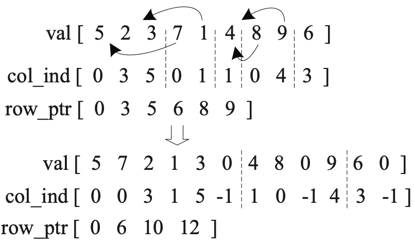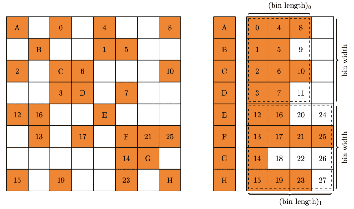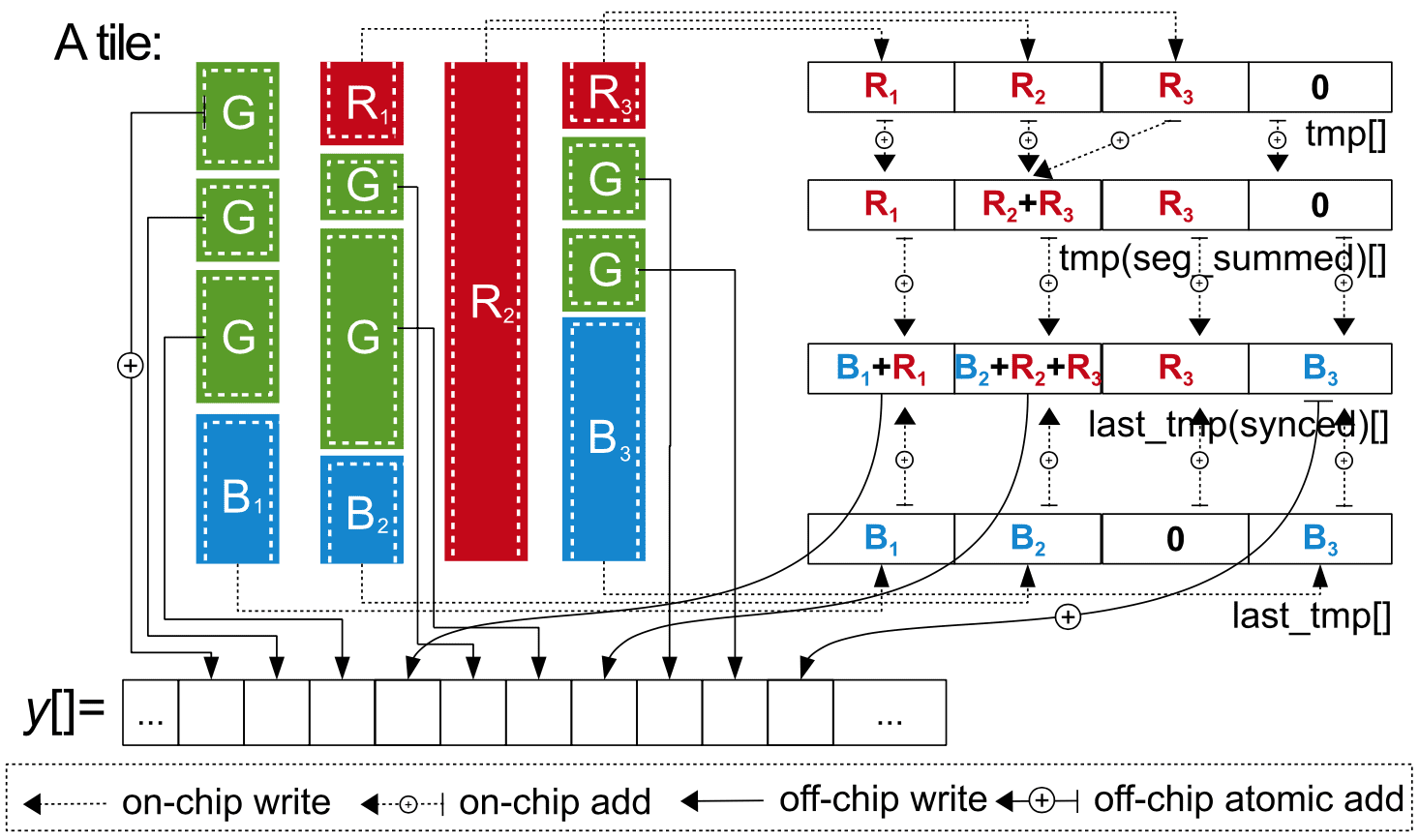 上图的上半部分是一个CSR格式的存储,虚线是每一行的分界线,这个例子将两行合并到SIC的一行交错存储(两行分为一组,每组用ELL的方式存储,每组的长度与这一组最多非零元数量的一行有关,需要补零)。一个wrap负责SIC的一行,保证了对于结果向量同一位的修改有wrap内自带的原子性。为了保证补零不要太多,以及wrap内不同线程的负载均衡,原矩阵会先根据行非零元数量先进行一个排序,按照非零元数量降序排列,使得每一组行非零元数量差不多。
