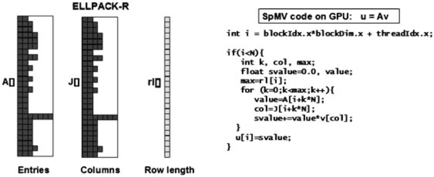 根据GPU的传统艺能,每一组都按列交给一个wrap处理,线程和行号没有严格的绑定关系,只要按照列方向将一个组的内容在线性空间里面排开,然后线程交叉处理,合并IO。通过规则的group分别和groupsize变化,可以推导出每一个非零元的行号和列号。ia代表了每个组的累积计算量(在线性存储空间a中的起始位置),通过每个组的行数,除一下就可以推出这一组中每一行在线性空间中存储范围,以及每个元素的纵坐标(因为是按列方向拉伸成线性数组的)。这样子值、行索引、列索引就都知道了,SpMV就能算了。