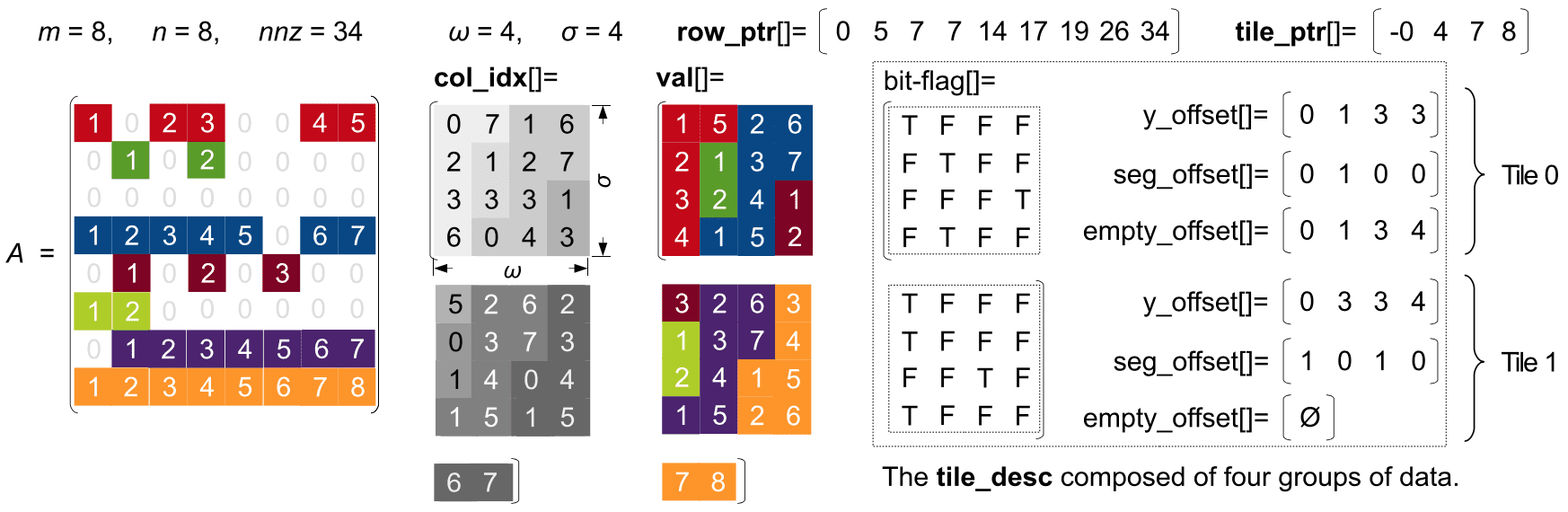 当一个tile中有空行的时候,比如Tile 0的第二行,就需要引入empty_offset来记录每一个行首元素所属于的行,因为y-offset是不考虑空行的。tile_desc,即每一个非零元块的描述中的所有数据都可以用一个或者多个kernal生成。