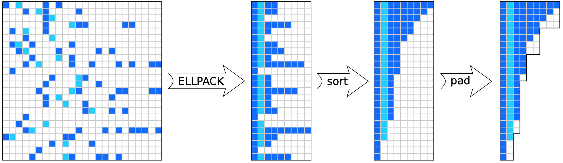 行方向不均衡的矩阵会带来严重的线程发散,而使用ELL的方式虽然缓解了线程发散,但是在不均衡的稀疏矩阵中会带来冗余计算。在假设每个线程负责一行的前提下,将行按照非零元数量进行排序,然后将矩阵在行方向上分块,根据每个块的具体情况进行补零,就可以减少补零,如下图所示: