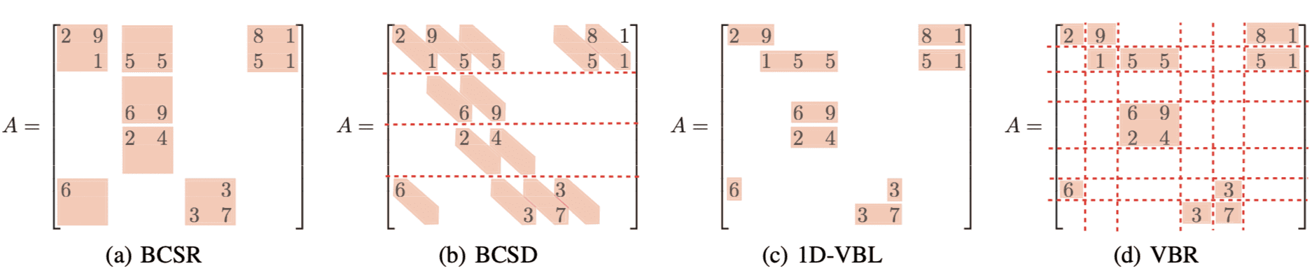 文章首先先确立了一个baseline,Block-CSR。在矩阵分块,将不全是0的块存储在连续存储的空间里: