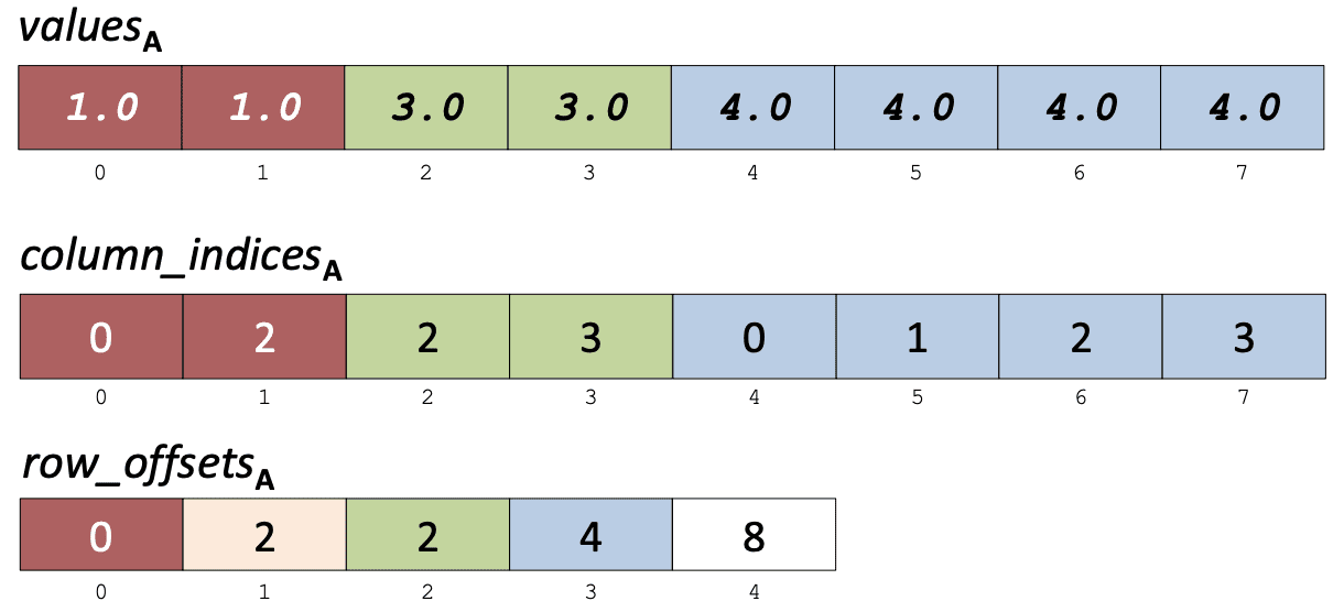 c和d两张图是第二种典型的分块方式:变化分块大小。因为分块的大小可以变化,所以可以不用仔补零去追求固定的分块大小。但是变化的分块大小需要引入新的索引,比如块的大小。下图是1D-VBL的格式,整体在CSR格式的基础上加入一个记录块大小的数组: