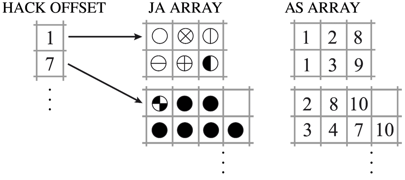 JA ARRAY是列索引,AS ARRAY是值,HACK OFFSET每个行条带非零元索引的起始位置。这里面没有记录每一个行条带的行非零元数量,因为使用的是定长的行分块,所以每个行条带的行数量是一样的。