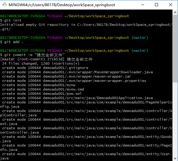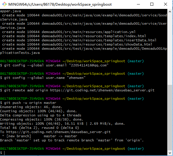 | 1.git init 2.git add . 3.git commit -m "提交全部文件" 4.git config --global user.email "xxx@qq.com" 5.git config --global user.name "xxx" 6.git remote add origin https://git.coding.net/xxxxxx/daxuebao.git 7.git push -u origin master |
