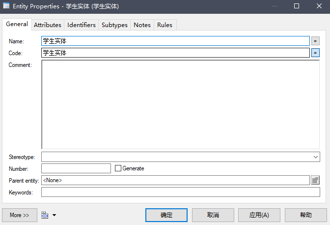 - Code:编辑 name 时,code 自动更改,一般为英文,创建数据库时使用该 code。相当于真实姓名 周树人。在不同的实体中,Code 必须唯一。