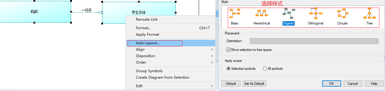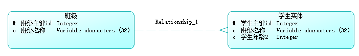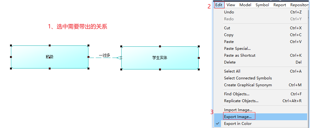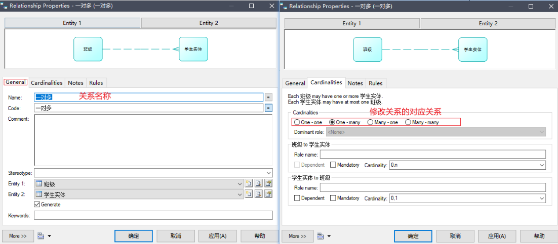 选择关系按钮,上图的3操作,从一个实体,拉到另外一个实体创建连接: