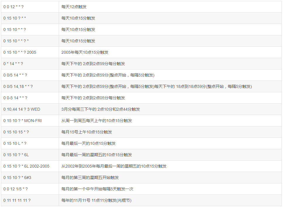 ?表示不指定值,即不关心某个字段的取值时使用。需要注意的是,月份中的日期和星期可能会起冲突,因此在配置时这两个得有一个是?*表示所有值,例如:在秒的字段上设置*,表示每一秒都会触发,用来分开多个值,例如在周字段上设置 “MON,WED,FRI” 表示周一,周三和周五触发-表示区间,例如在秒上设置 “10-12”,表示 10,11,12秒都会触发/用于递增触发,如在秒上面设置”5/15” 表示从5秒开始,每增15秒触发(5,20,35,50)#序号(表示每月的第几个周几),例如在周字段上设置”6#3”表示在每月的第三个周六,(用 在母亲节和父亲节再合适不过了)- 周字段的设置,若使用英文字母是不区分大小写的 ,即 MON 与mon相同